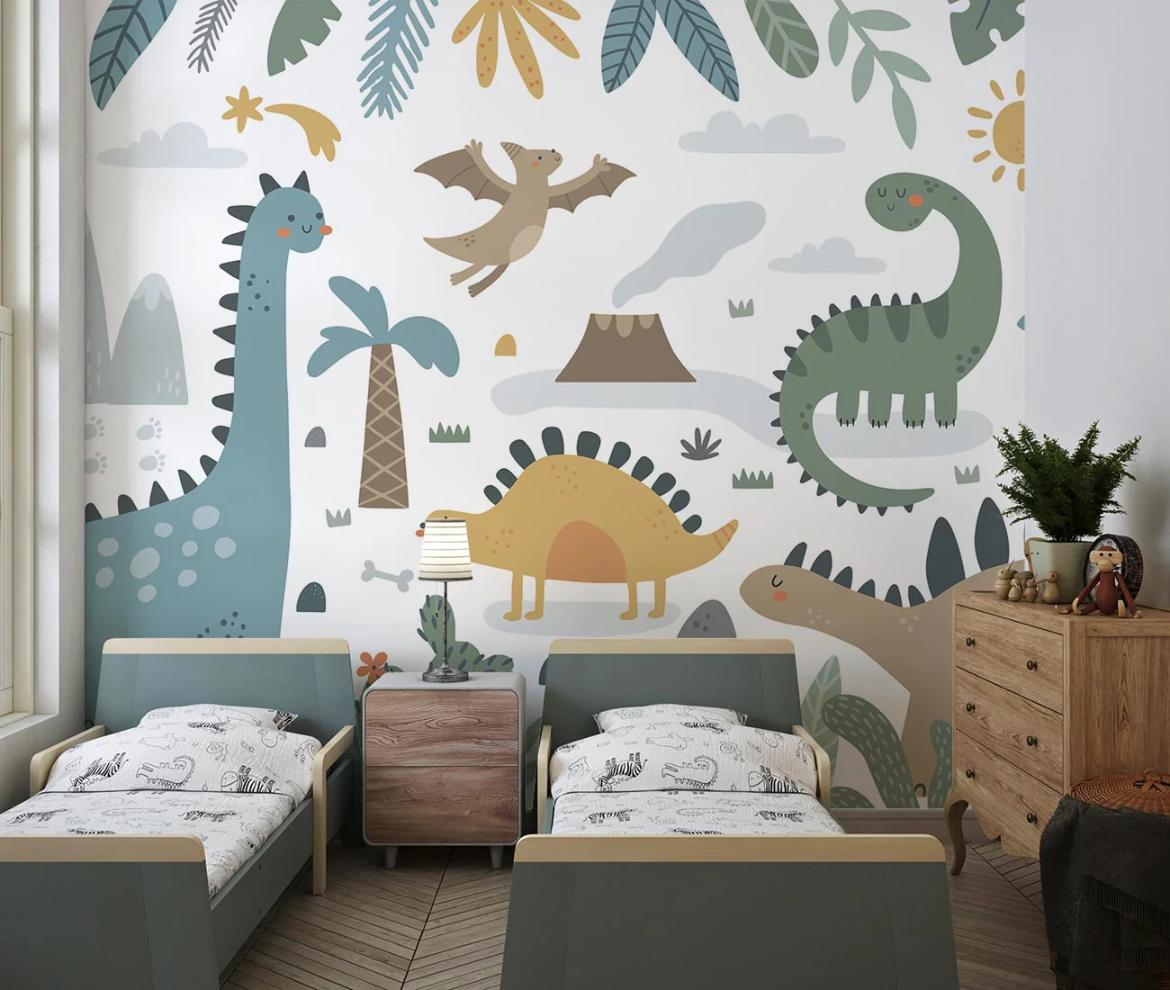 The placement of the dinosaur wallpaper mural with regard to the room is another factor to take into consideration. One of the most typical options is to decorate the wall behind the bed, which results in the creation of a stunning and immersive background for both sleeping and playing. Alternately, you could utilise the mural as a focal wall in a study or play space to give it a distinct character.